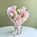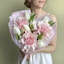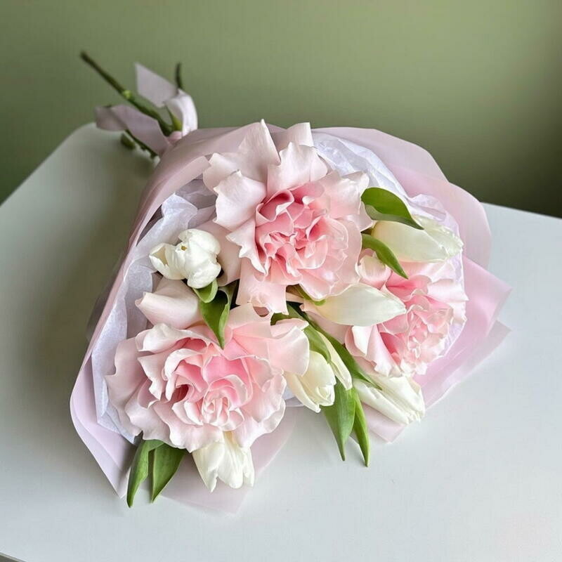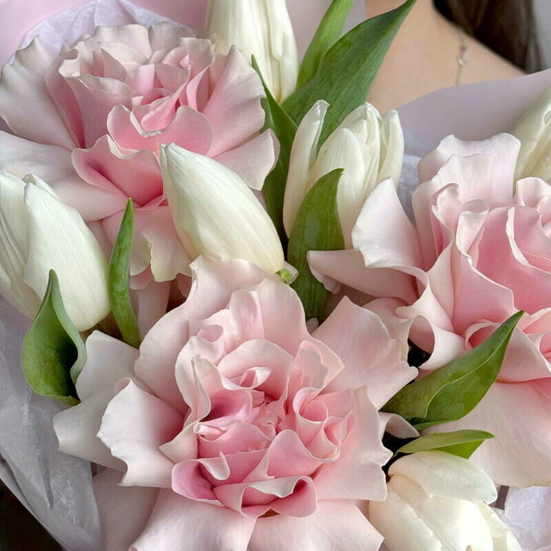 Состав: тюльпан белый - 6 шт., французская роза пинк мондиаль - 3 шт. Размер: ширина - 28 см, высота - 40 см.