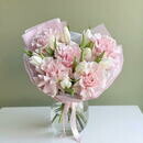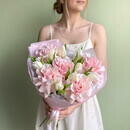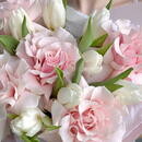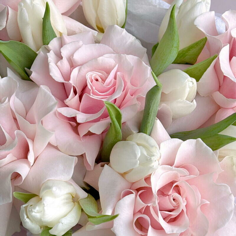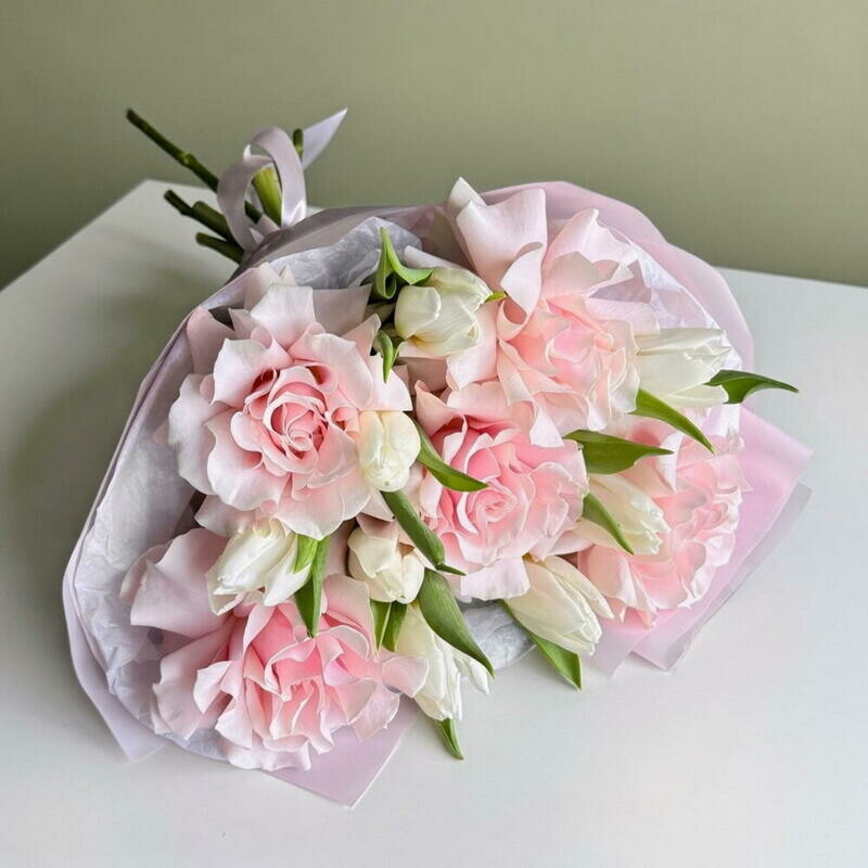 Состав: тюльпан белый - 8 шт., французская роза пинк мондиаль - 5 шт. Размер: ширина - 32 см, высота - 40 см.