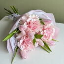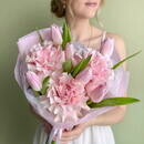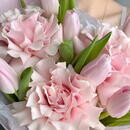 Состав: тюльпан розовый - 6 шт., французская роза пинк мондиаль - 3 шт. Размер: ширина - 28 см, высота - 40 см.