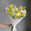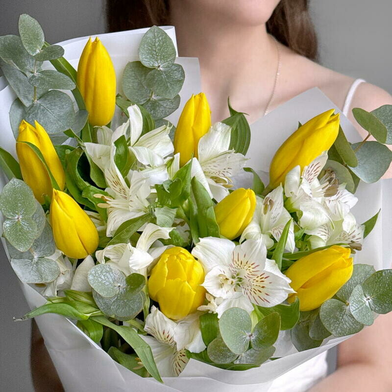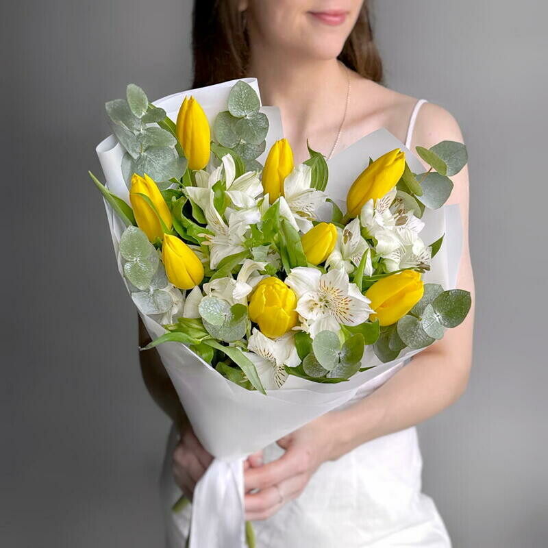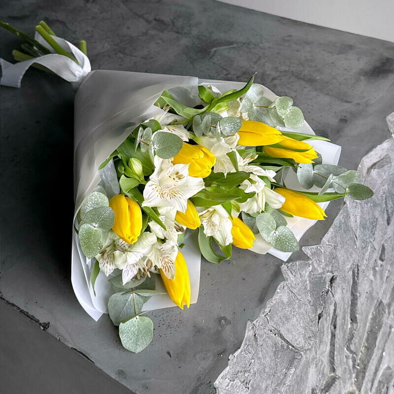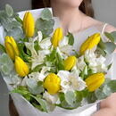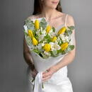 Состав: альстромерия - 3 шт, тюльпан - 8 шт, эвкалипт - 4 шт. Размер: ширина - 27 см, высота - 40 см.