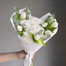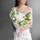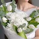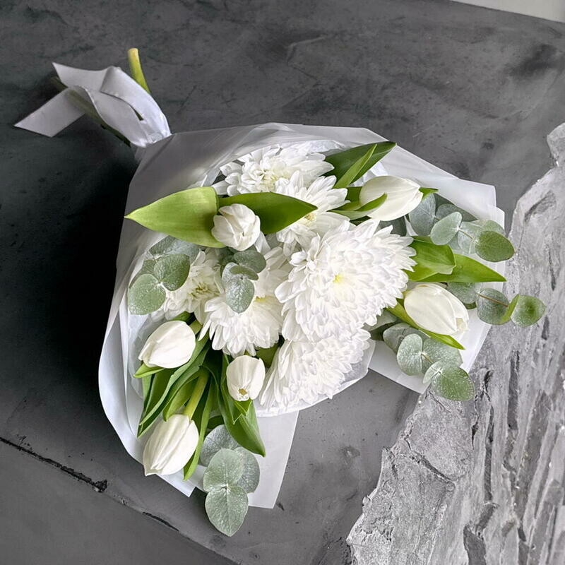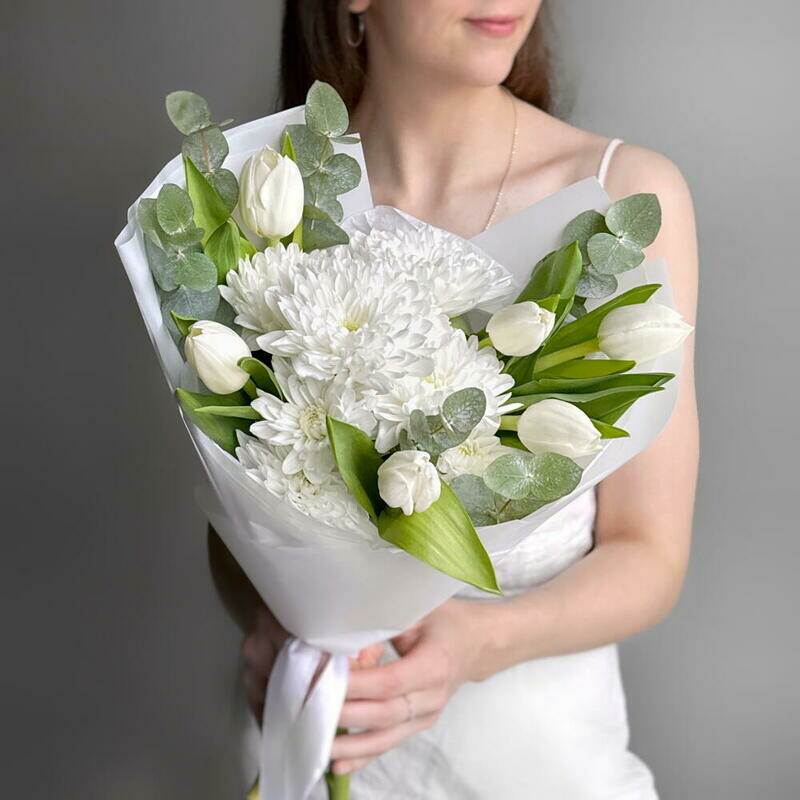 Состав: тюльпан - 6 шт., эвкалипт - 4 шт., кустовая хризантема - 1 шт. Размер: ширина - 25 см, высота - 40 см.