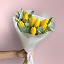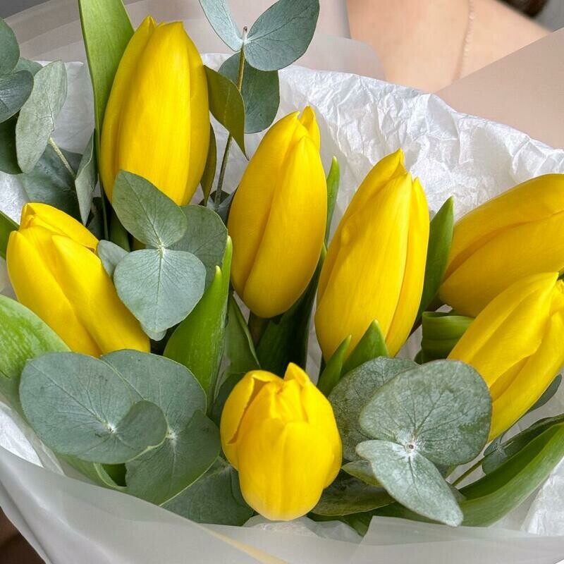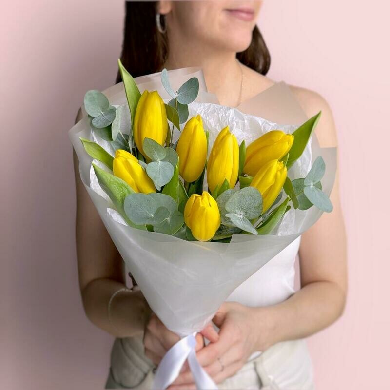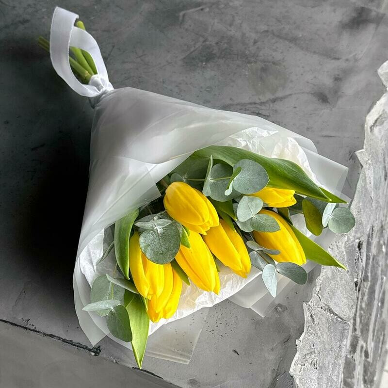 Состав: желтый тюльпан - 7 шт., эвкалипт cineria - 4 шт. Размер: ширина - 23 см, высота - 47 см.