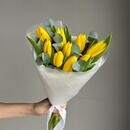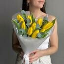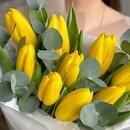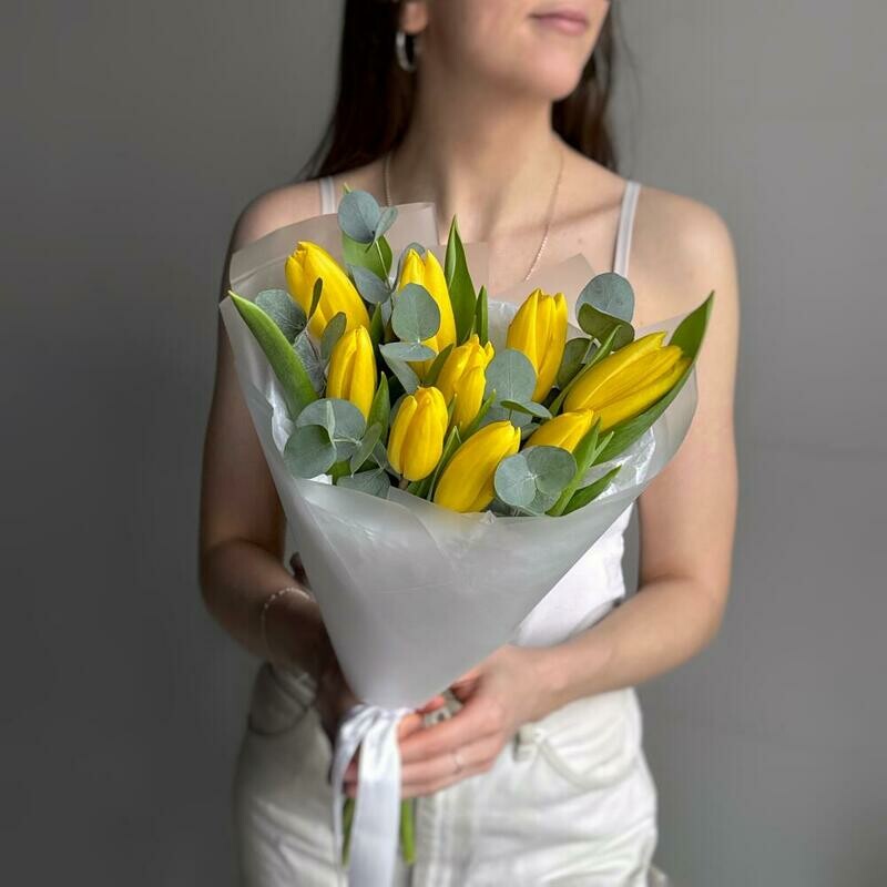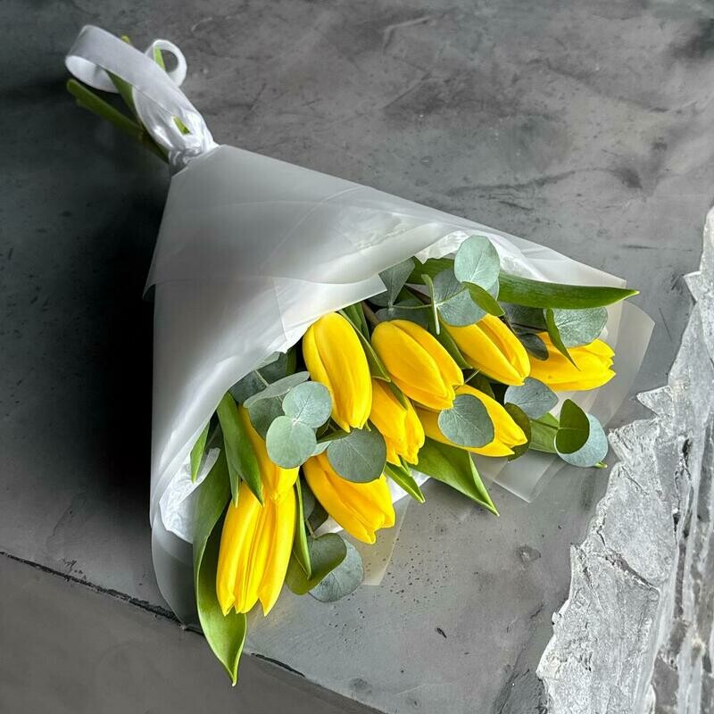 Состав: желтый тюльпан - 9 шт., эвкалипт cineria - 4 шт. Размер: ширина - 23 см, высота - 47 см.