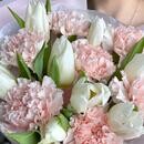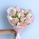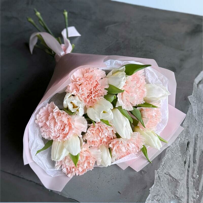 Состав: белый тюльпан - 8 шт., розовый диантус - 7 шт. Размер: ширина - 28 см, высота - 43 см.