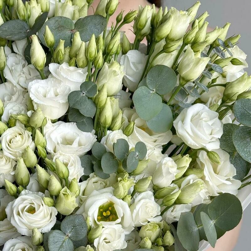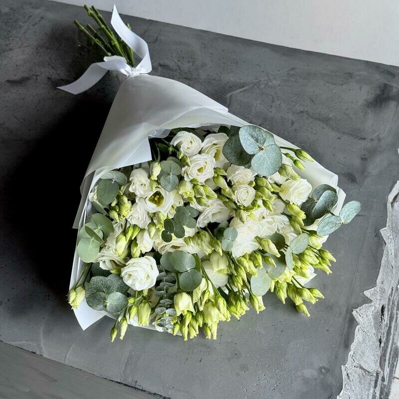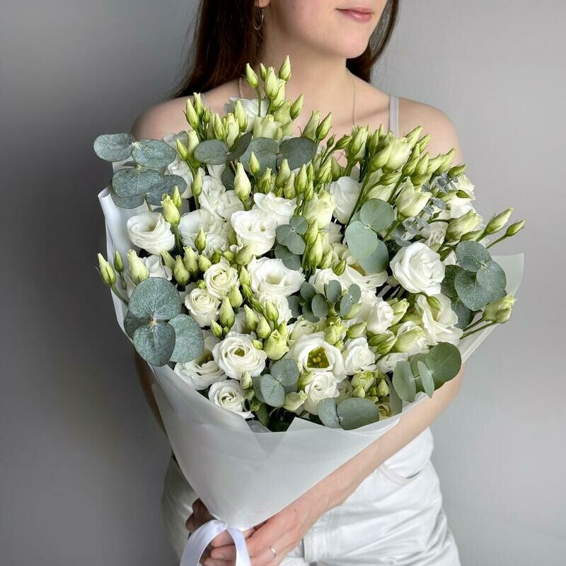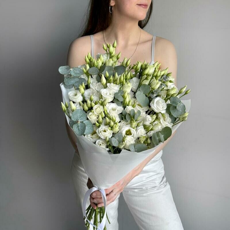 Состав: лизиантус Белый - 11 шт., эвкалипт cineria - 6 шт. Размер: ширина - 34 см, высота - 55 см.