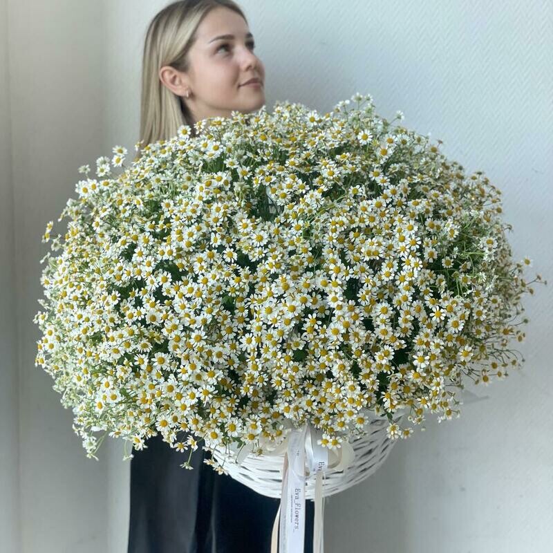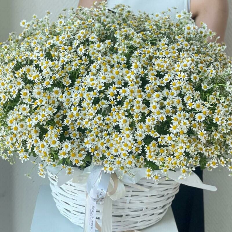 Состав: ромашка - 101 шт., лента атласная - 4 шт., корзина плетеная - 1 шт., оазис флористический - 3 шт. Размер: ширина - 60 см, высота - 40 см.