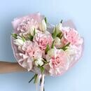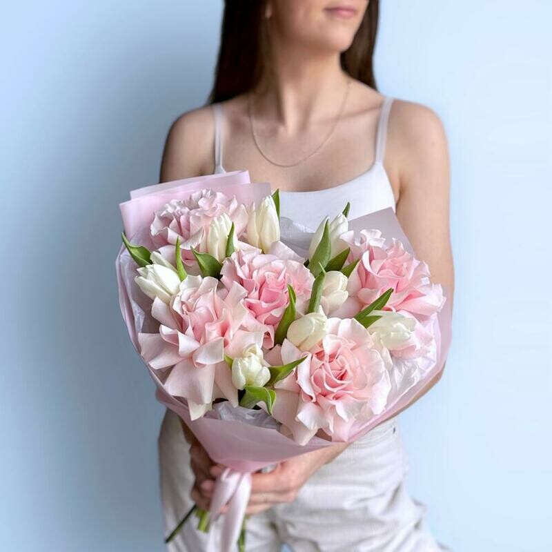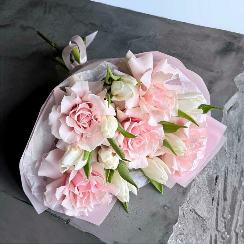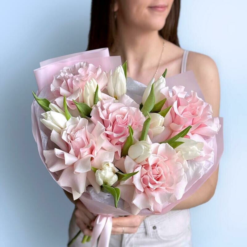 Состав: тюльпан белый - 8 шт., роза pink mondial - 5 шт. Размер: ширина - 32 см, высота - 43 см.