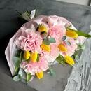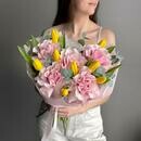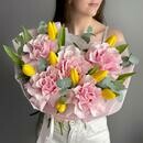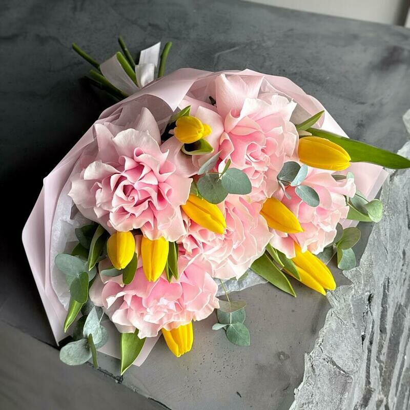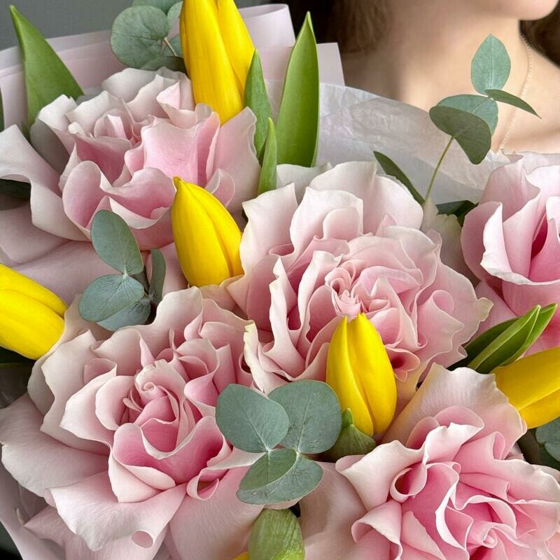 Состав: желтый тюльпан - 8 шт., эвкалипт cineria - 4 шт., французская роза pink mondial - 5 шт. Размер: ширина - 34 см, высота - 50 см.