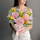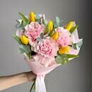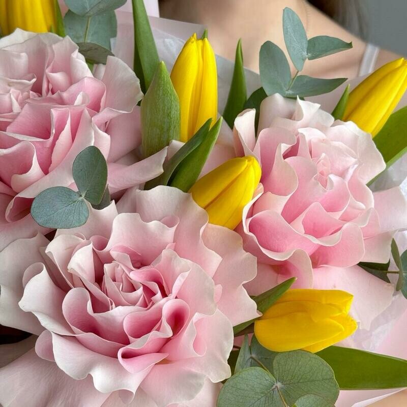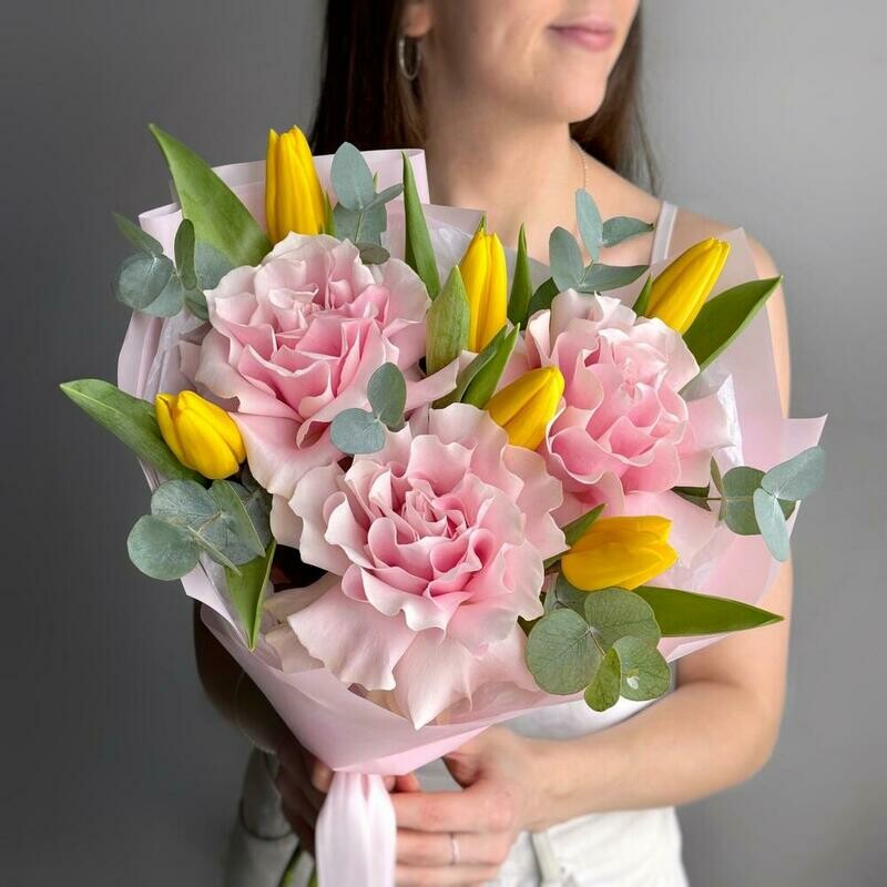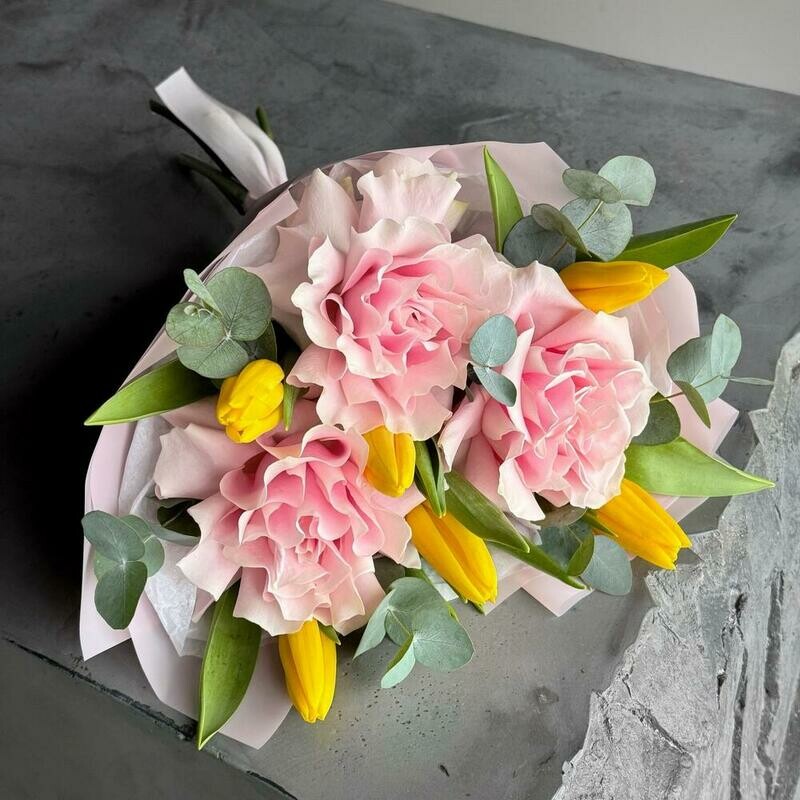 Состав: желтый тюльпан - 6 шт., эвкалипт cineria - 4 шт., французская роза pink mondial - 3 шт. Размер: ширина - 30 см, высота - 50 см.