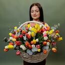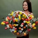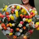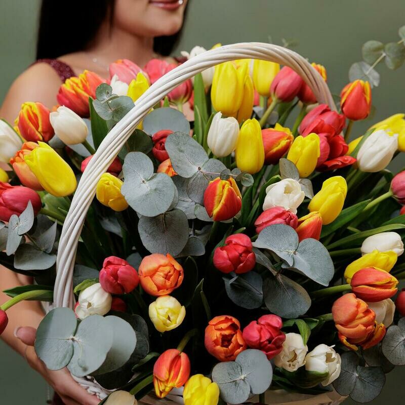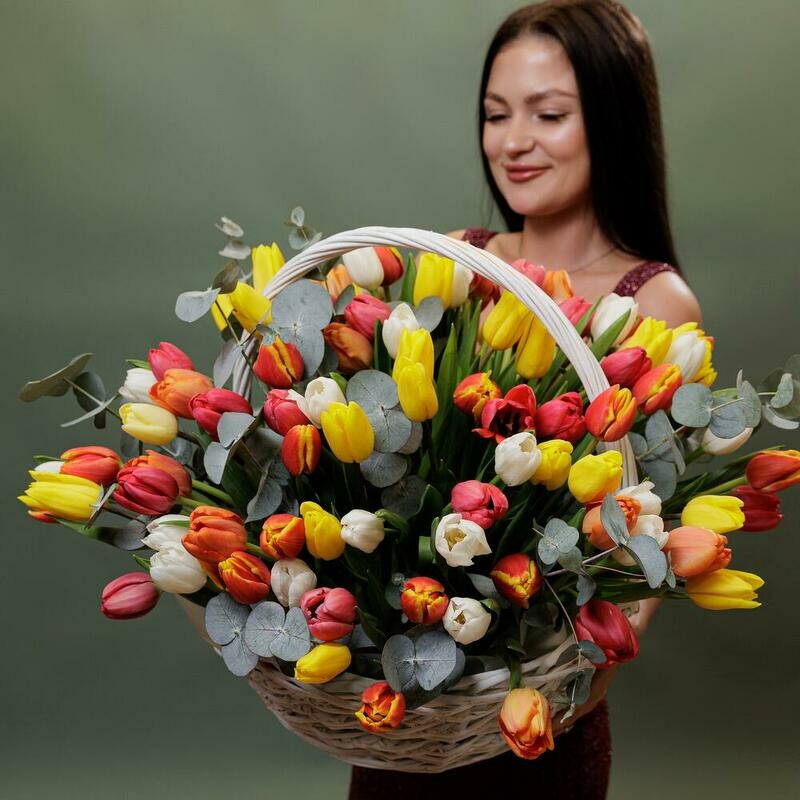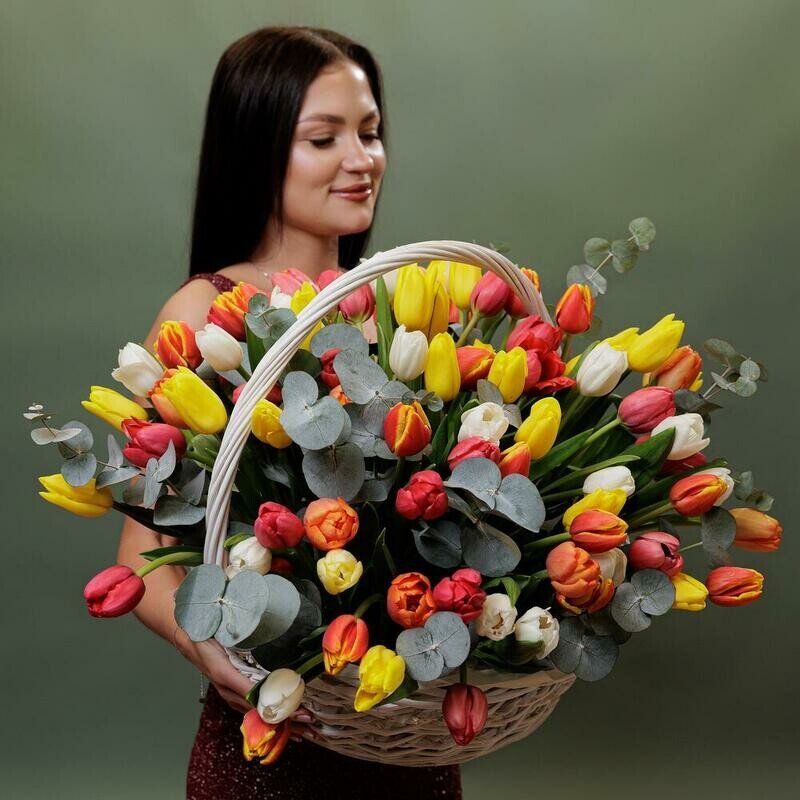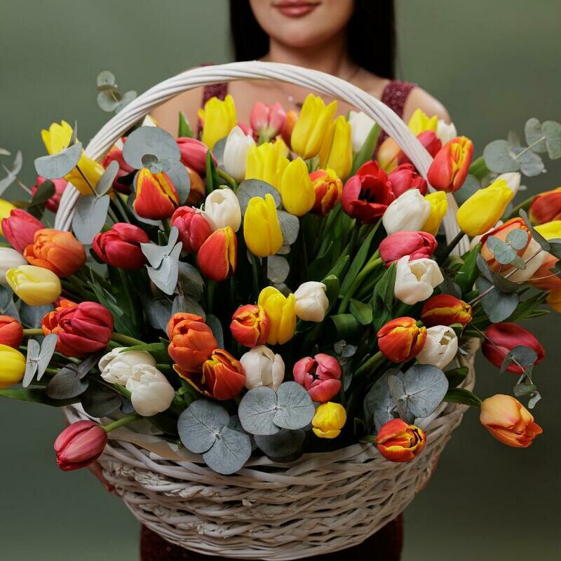 Состав: корзина - 1 шт, тюльпан - 101 шт, эвкалипт - 2 шт, оазис - 3 шт, упаковка дизайнерская - 1 шт. Размер: ширина - 60 см, высота - 55 см.