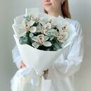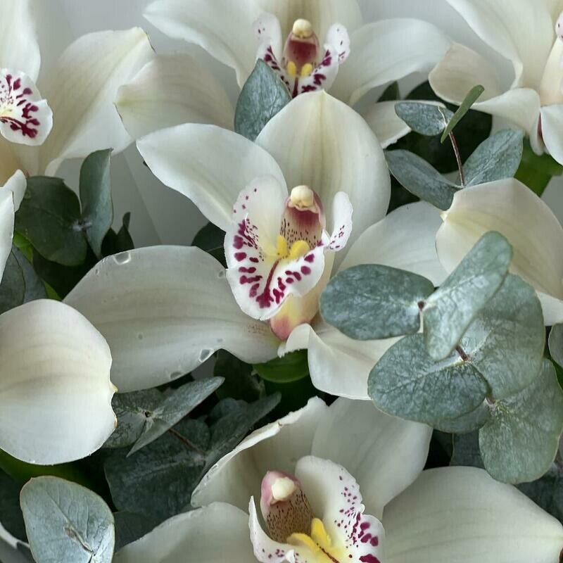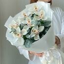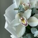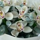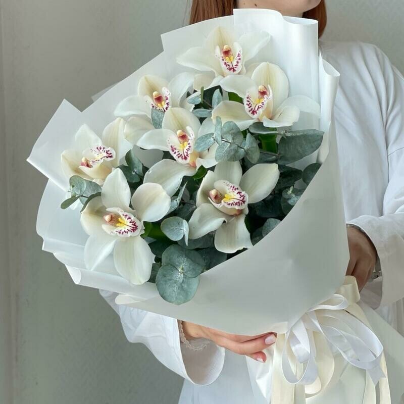 Состав: орхидея цимбидиум - 7 шт., эвкалипт - 5 шт, лента атласная - 2 шт., упаковка дизайнерская - 2 шт. Размер: ширина - 25 см, высота - 35 см.