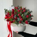 - 35 тюльпанов в коробке с добавлением эвкалипта