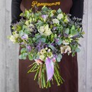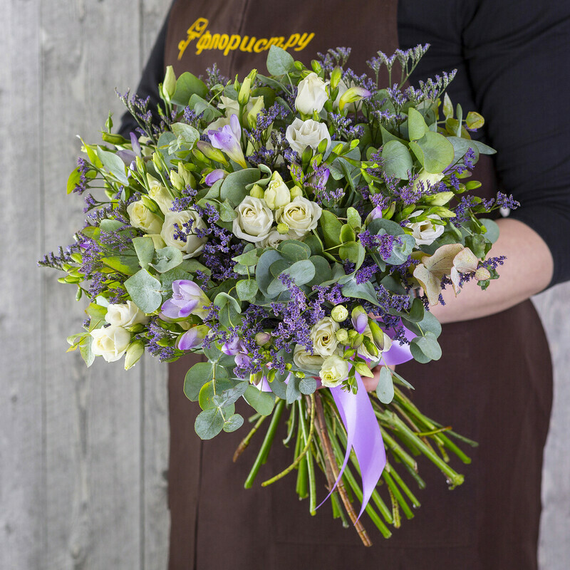 Совершенно очаровательный, одухотворённый, по-французски стильный и утончённый букет создан из синих фрезий, лазоревого лимониума и белоснежных лизиантусов. Этот цветочный комплимент в духе романтики Прованса, без сомнения, мечтает получить любая девушка. Порадуйте вашу непревзойдённую и любимую таким вдохновляющим сюрпризом, поднимающим настроение и дарящим ваши искренние чувства.