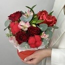 - Композиция в коробке из красных роз и хлопка с шариком в виде сердца