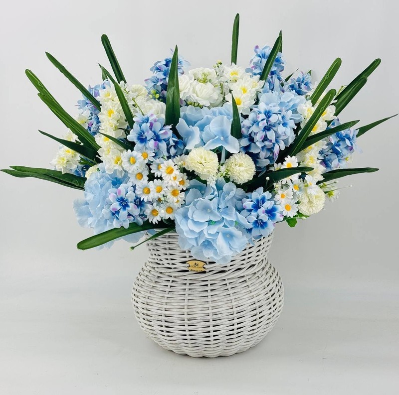 - Композиция искусственных цветов премиум в кашпо из искусственного ротанга. Интерьерный букет