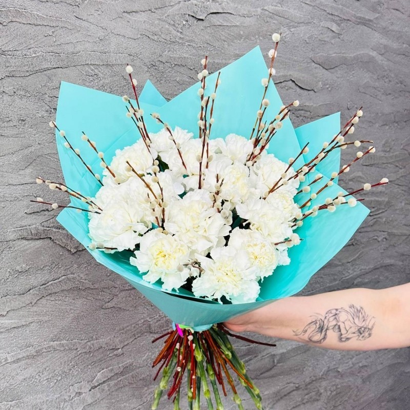 - Букет белых гвоздик в голубой упаковке с веточками вербы. Нежные диантусы. Пасхальный букет