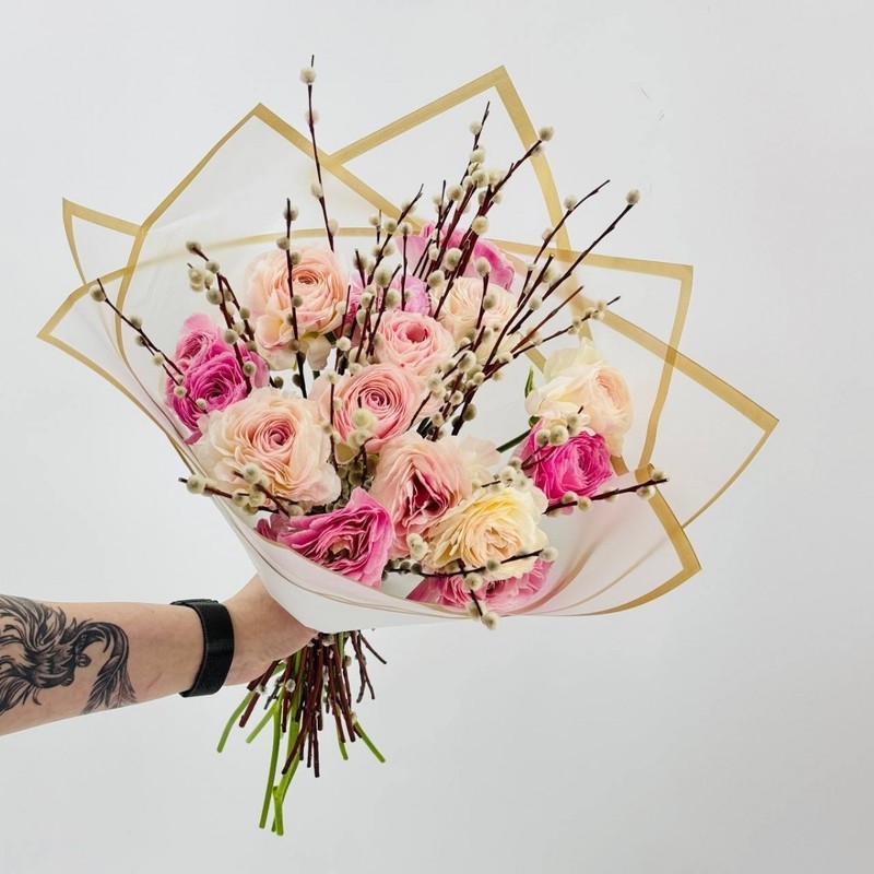 - Букет нежных ранункулюсов лютиков с веточками вербы в дизайнерской упаковке. Пасхальный букет