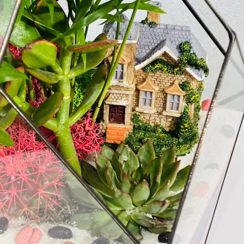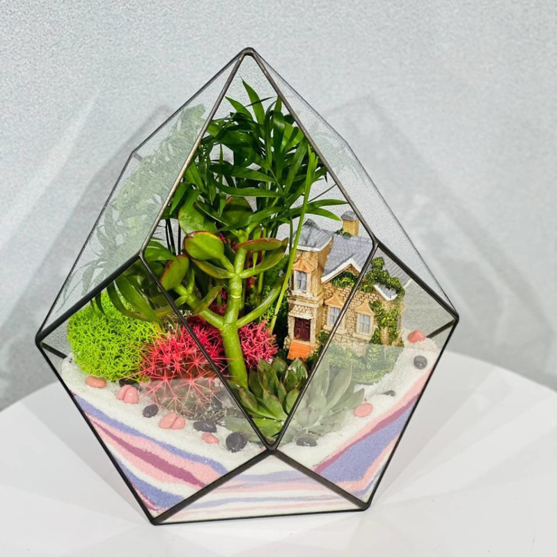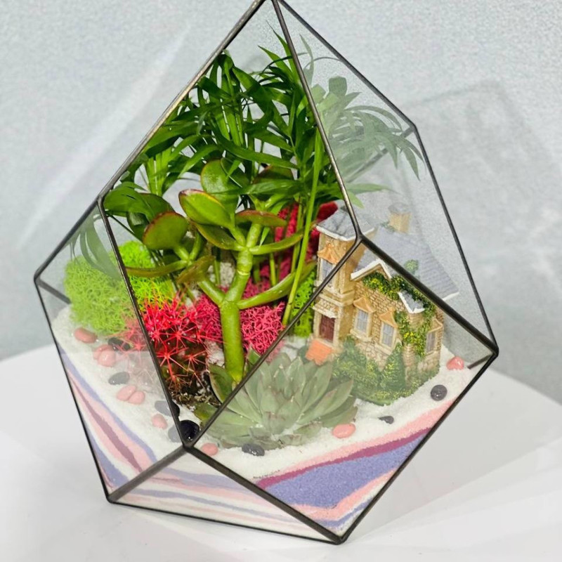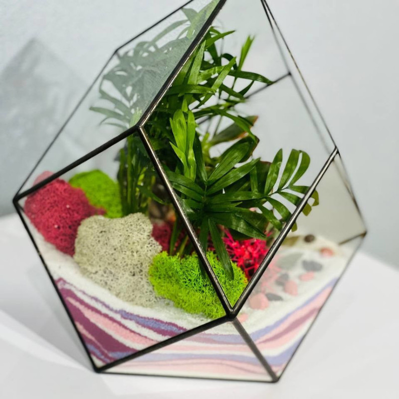 Флорариумы моссариумы из стекла, с живыми растениями, начали набирать особенную популярность в последние года: они не занимают много места, красиво смотрятся и не нуждаются в особой заботе, так как микроклимат внутри сосуда формируется самими растениями. Такой подарок идеально подойдёт для тех, кто не любит ухаживать за цветами или попросту некогда, отлично впишется в интерьер офиса. Мини-аквариум флорариум декорируется натуральными материалами такими как камни, ракушки, цветной песок, стабилизированный мох и неприхотливыми растениями такими как кактус, суккулент, толстянка, хавортия, эхеверия. Флорариум это лучшая альтернатива срезанным цветам, которые завянут через несколько дней. Это прекрасный подарок для мамы, бабушки, учителя, любимой девушки, для всех тех, кто любит живые цветы. Это необычный подарок на свадьбу, новоселье, день рождения, новый год и любой другой праздник. Маленький ботанический мир, впишется в любой интерьер и будет радовать долгое время.