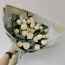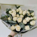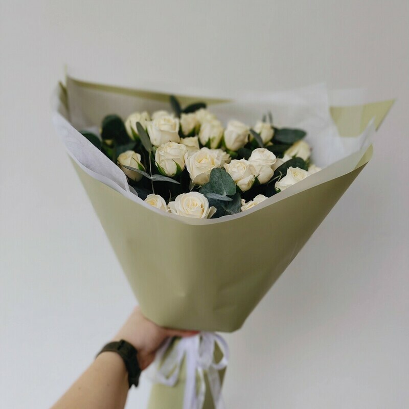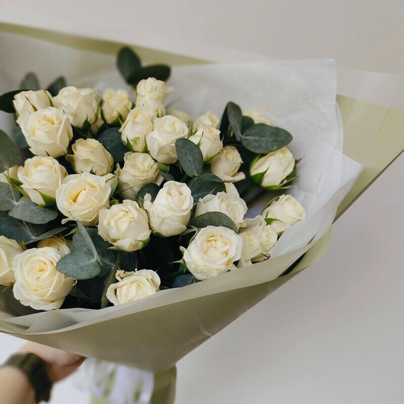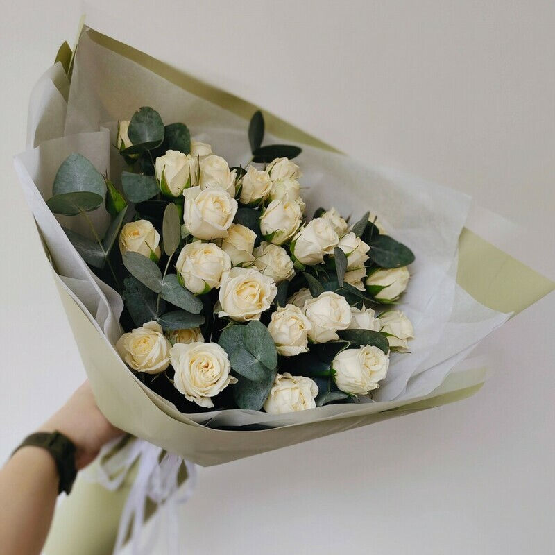 Стильный классический букет из белых кустовых роз с эвкалиптом идеален на любое торжество