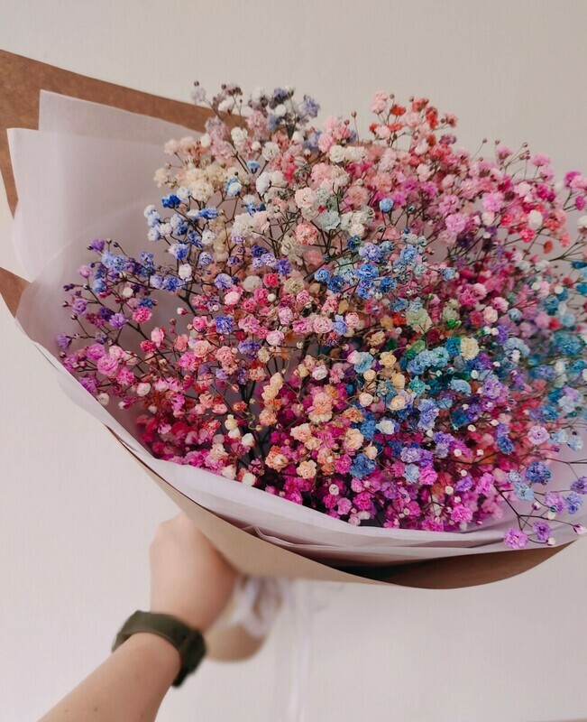 Для любителей ярких и долгостоящих цветов прекрасно подойдет букет из разноцветных гипсофил