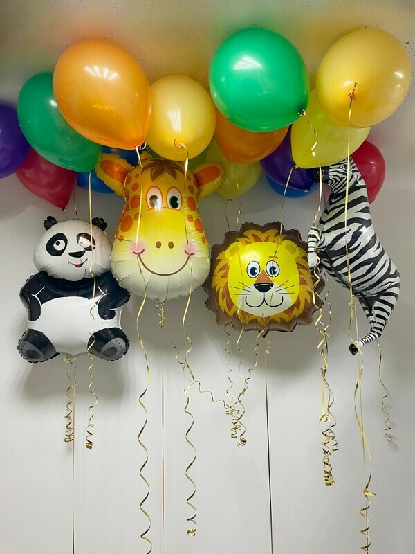 Набор "Сафари малое" * включает: фигуру голова льва, фигуру панды, фигуру голова жирафа, фигуру зебра с гелием на грузе каждая и 20 разноцветных шаров в потолок с гелием Весь латекс обработан специальным раствором для долготы полета. Упаковка в транспортировочный пакет