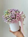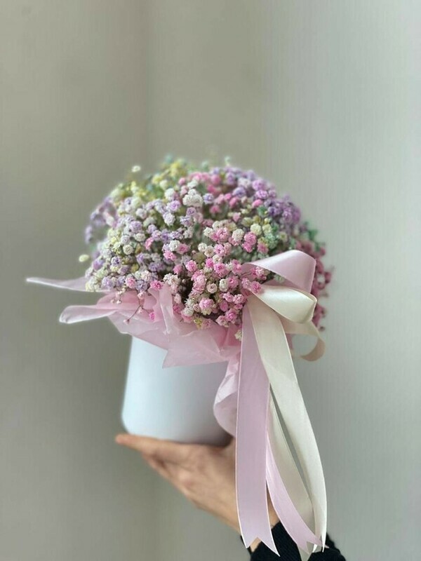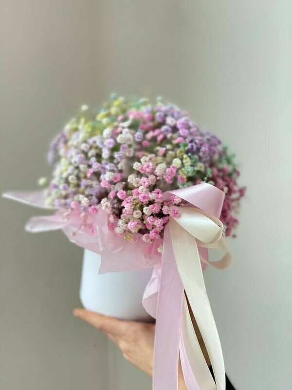 Эта милая белая коробочка украшена изящным бантиком из радужной стойкой гипсофилы. Цветочная композиция в ярких, пастельных оттенках радуги создает ощущение свежести и радости. Идеальный подарок или милый декор для домашнего интерьера, добавляющий светлых и позитивных нот в любой интерьер. Коробочка выполнена аккуратно и элегантно, делая её особенно привлекательной и уютной.