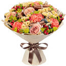 Мы очень любим, когда букеты не просто красивые, но и ароматные. И это как раз про композицию "Ягодный Круассан". Гвоздики, хризантемы сантини, розы, золотые колоски пшеницы, палочки корицы, гиперикум, а также зелень котинуса, буплерума и эвкалипта сочетаются в атмосферную и ароматно-пряную композицию.