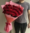 Красная роза каскадом 19 шт в розовую упаковку с лентой Указаны примерные размеры, чтобы вы могли представить внешний вид и масштаб, но фактически размеры могут немного отличаться.