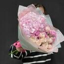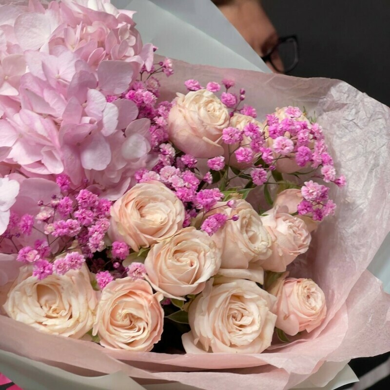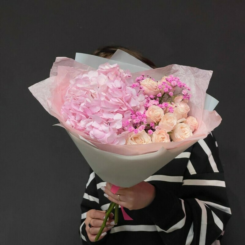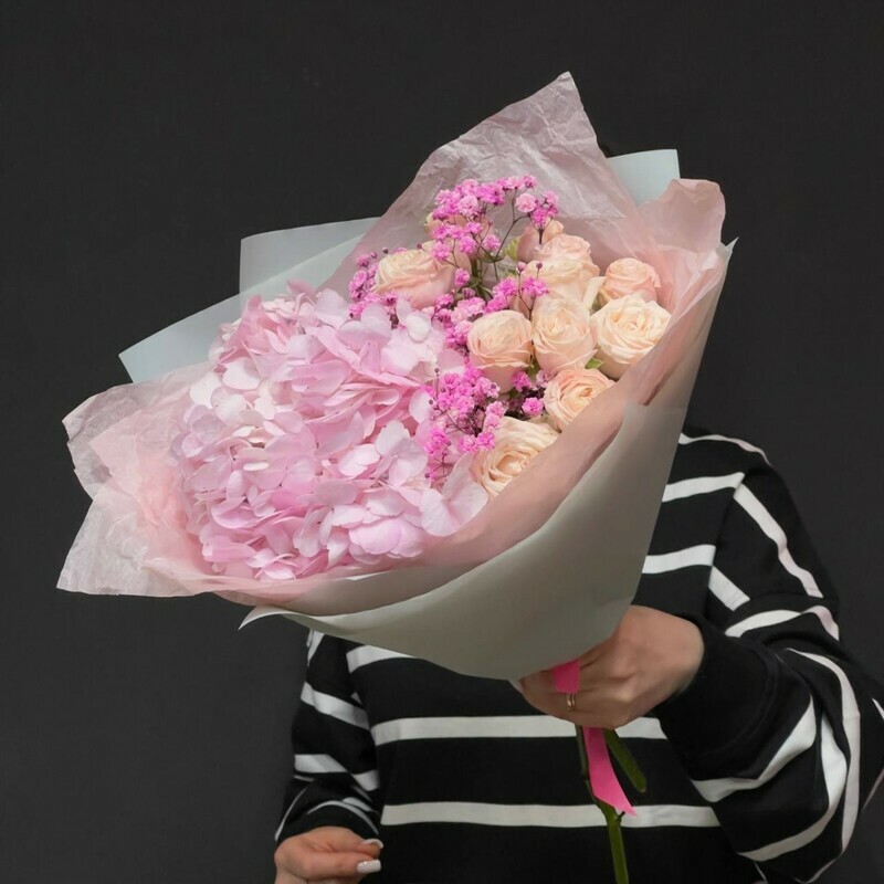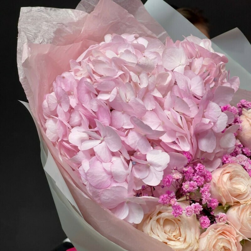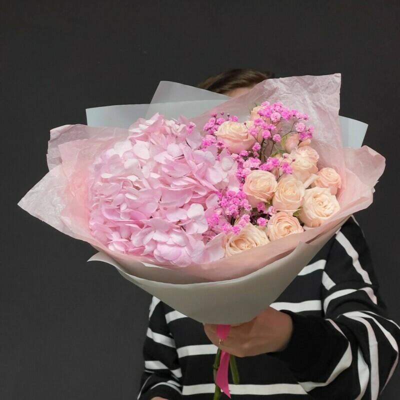 - Нежный букет из гортензии и пионовидных роз с гипсофилой