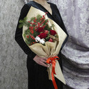 Роза одноголовая красная "Ред Наоми" - 3 шт Илекс - 2 шт Хлопок - 2 шт Корица - 1 шт Новогодний декор Лапник "Нобилис" Упаковка Крафт бумага