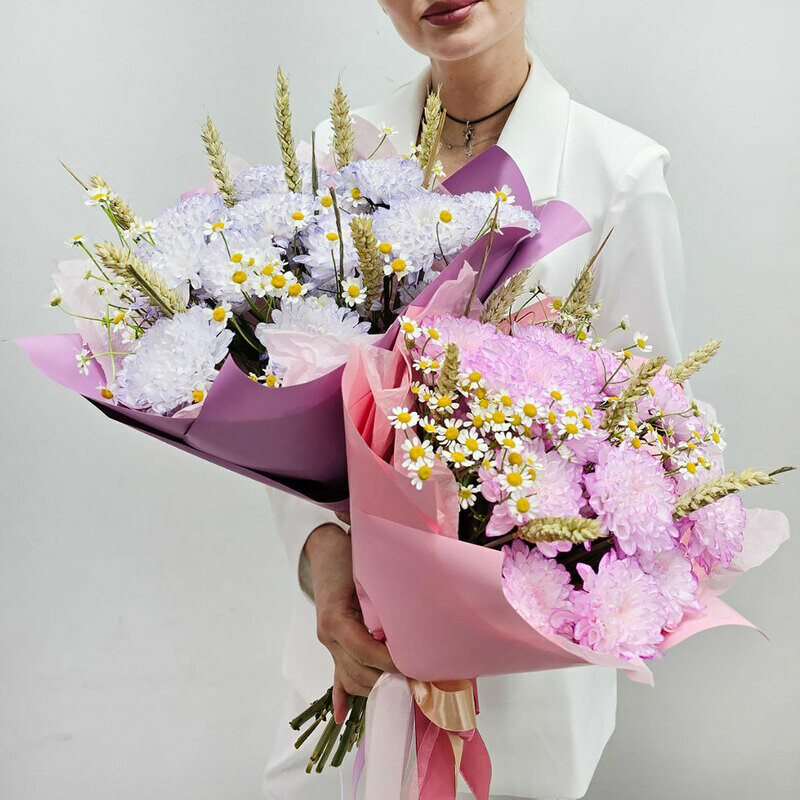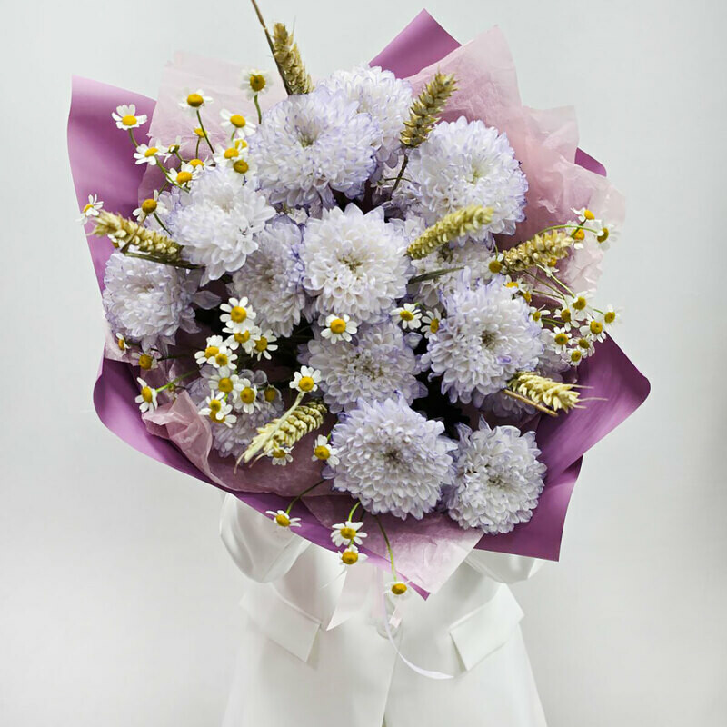 Букет из кустовой махровой хризантемы, танацетума и пшеницы от флористического салона «Талисман Флора» — это воплощение элегантности и природной красоты. Кустовая махровая хризантема — символизирует стойкость и долголетие, она создает атмосферу спокойствия и уюта. Её крупные, пышные соцветия с необычными лепестками, напоминающими бахрому, создают впечатление роскоши и изысканности. Танацетум — добавляет композиции свежести и легкости. Его нежные лепестки и приятный аромат делают букет ещё более привлекательным. Пшеница — добавляет композиции свежести и легкости. Её золотистые колосья и текстура делают букет ещё более привлекательным. Этот букет станет идеальным подарком для тех, кто ценит простоту и изысканность. Он добавит нотку спокойствия и гармонии в ваш день, напоминая о красоте и простоте природы.