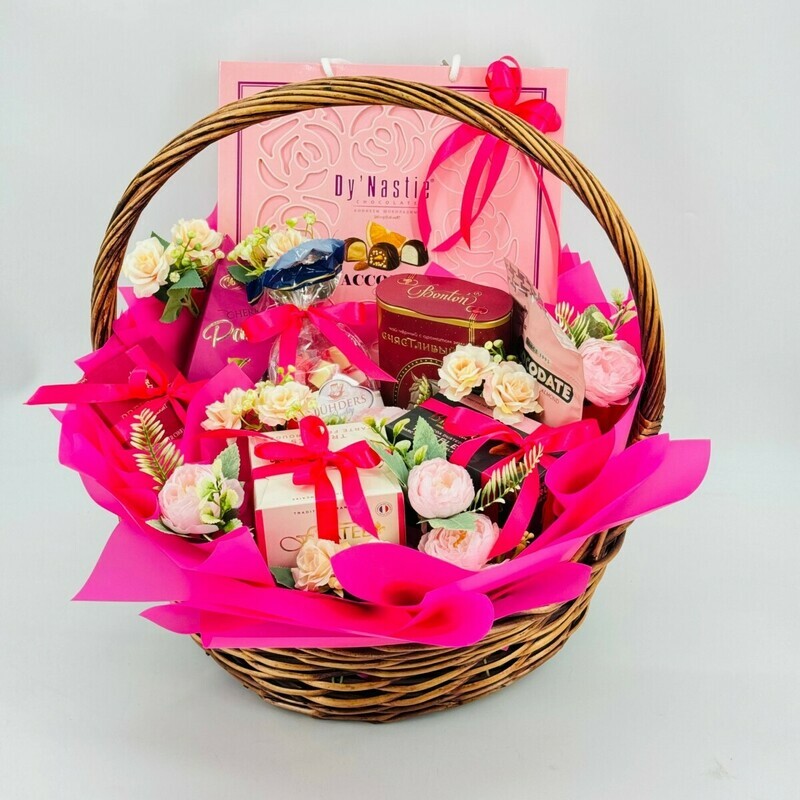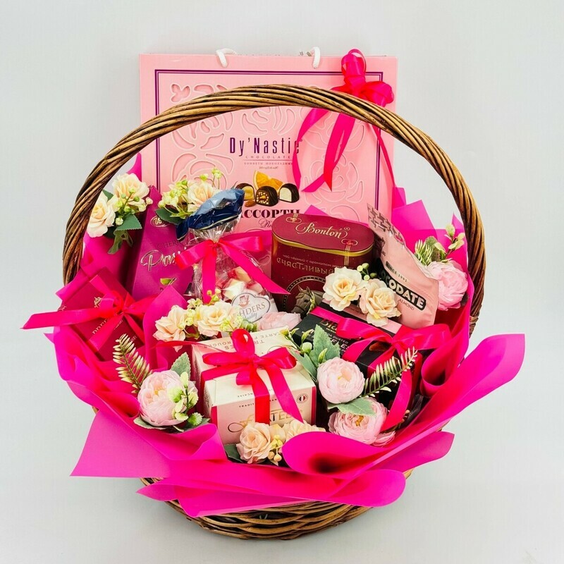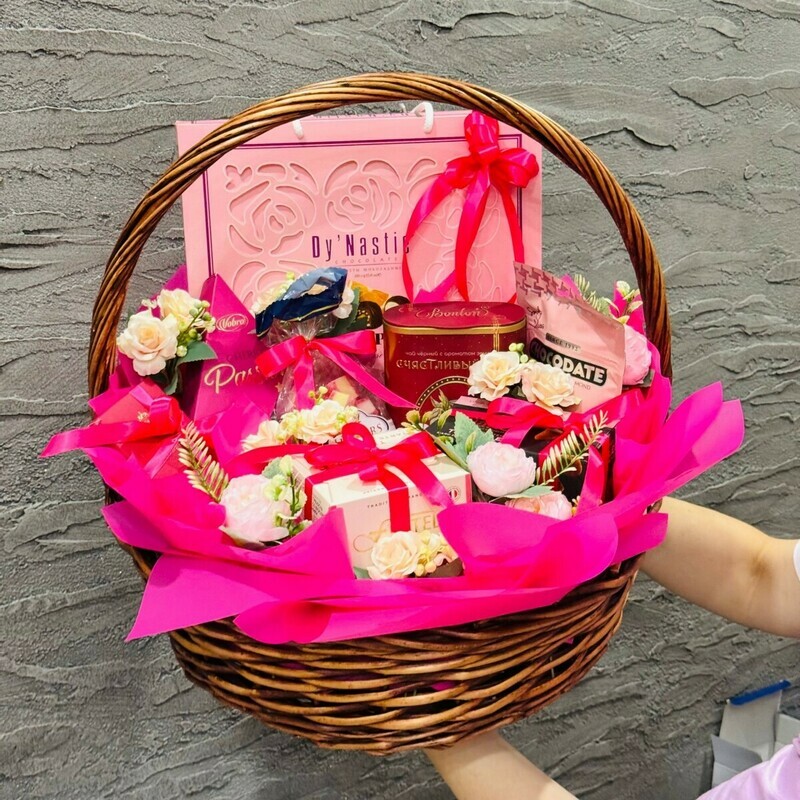 Готовый подарочный набор с любимыми изысканными конфетами, сладостями, чаем, в плетеной корзине ручной работы. Такой подарок приведет в восторг любительницу сладкого. Набор придется по душе женщинам всех возрастов. Каждый элемент этого подарочного набора создан с любовью и заботой, чтобы принести радость и удовольствие в вашу жизнь. Подарите себе и близким момент настоящего наслаждения, окунитесь в мир изысканных вкусов и нежных ароматов. Наш подарочный бокс сладостей - это идеальный подарок для настоящих гурманов и ценителей красоты, созданный для того, чтобы радовать каждый день. Идеальный подарок подруге, любимой девушке, учителю, руководителю, маме или сестре на день рождения, юбилей, День Влюблённых, 14 февраля, 8 Марта международный женский день, День матери, 1 сентября, День учителя, День Татьяны, Новый год, Рождество, Именины, Крестины, День Ангела, День семьи и другой праздник.