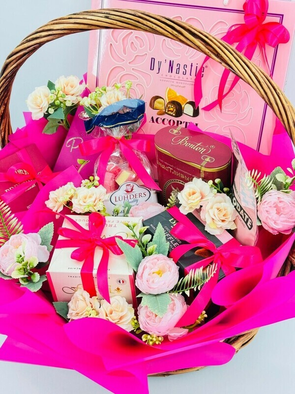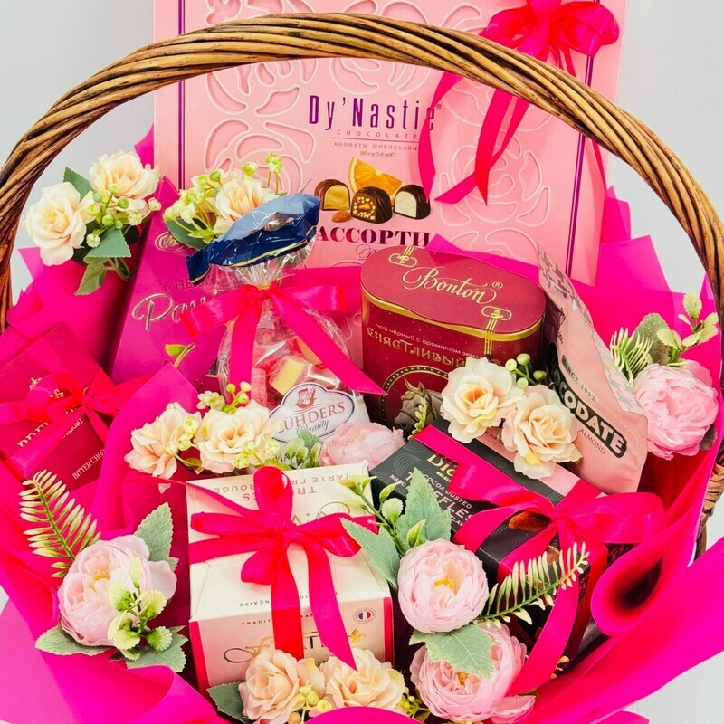 Большая подарочная корзина с европейскими сладостями декорированная искусственными цветами. Маме
