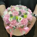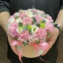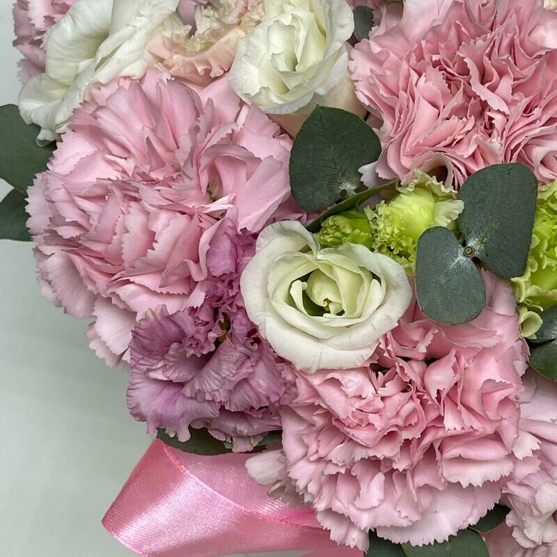 Кружевной диантус, эустома и ароматный эвкалипт в шляпной коробке, стандартный