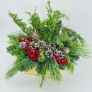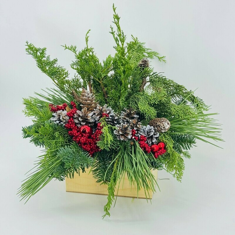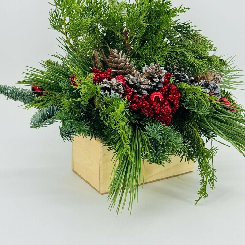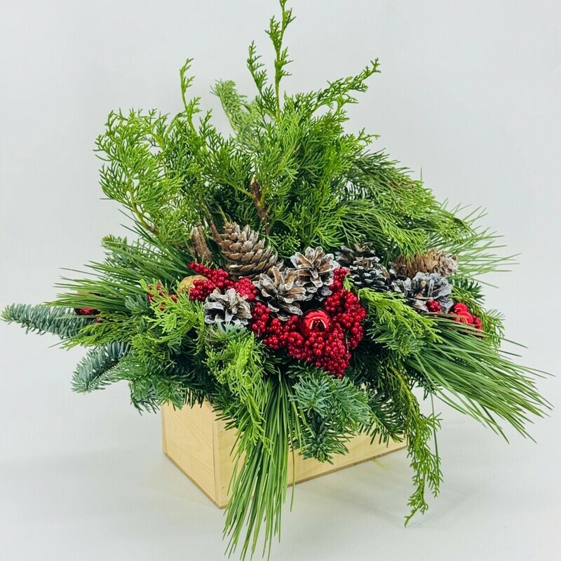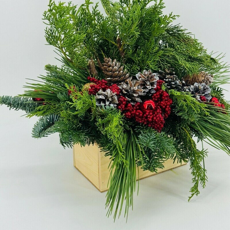 Новогодний букет, композиция из натуральной хвои нобилис в деревянном ящике с красными ягодами , стандартный