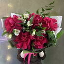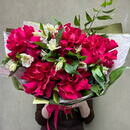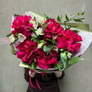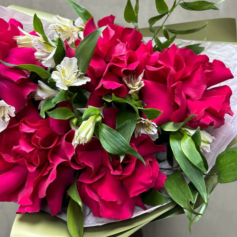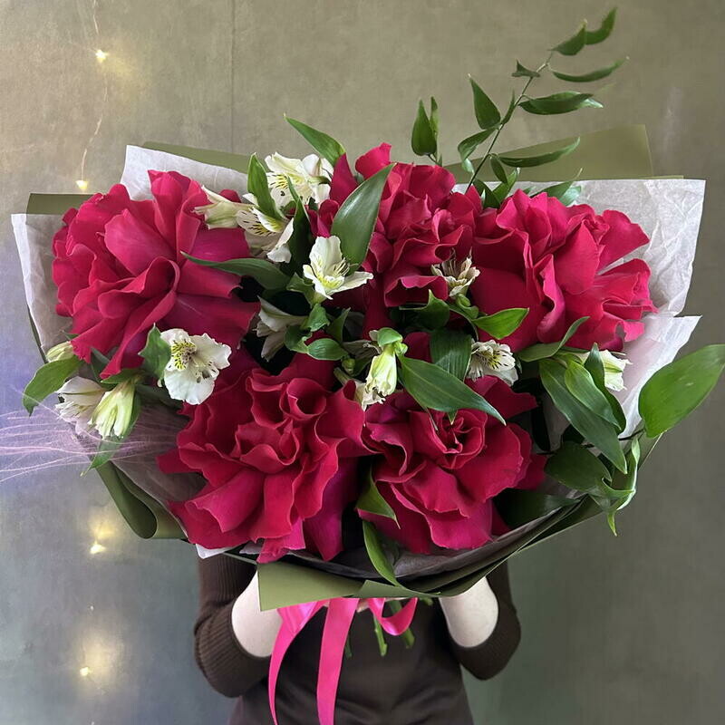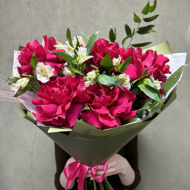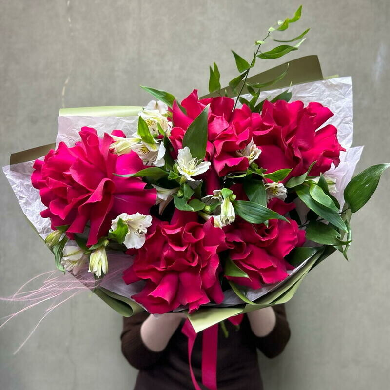 Яркий букет малиновых французских роз с альстромерией, рускусом и сухоцветом. Пышные, кружевные французские розы произведут впечатление и запомнятся. Для ваших самых искренних и добрых чувств К букету приложим открытку, средство для ухода за цветами в вазе и инструкцию, чтобы букет радовал как можно дольше.