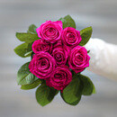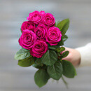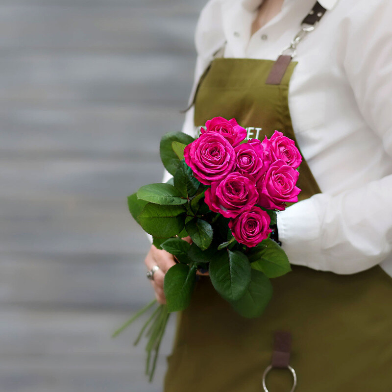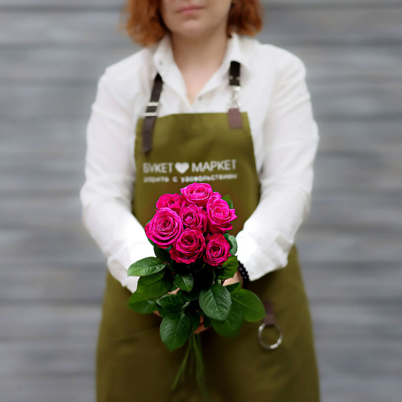 - Букет из 7 малиновых роз (Россия) с лентой 60 см