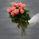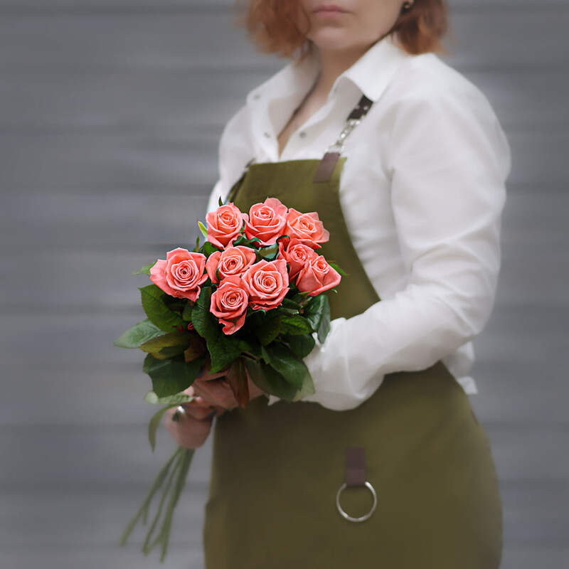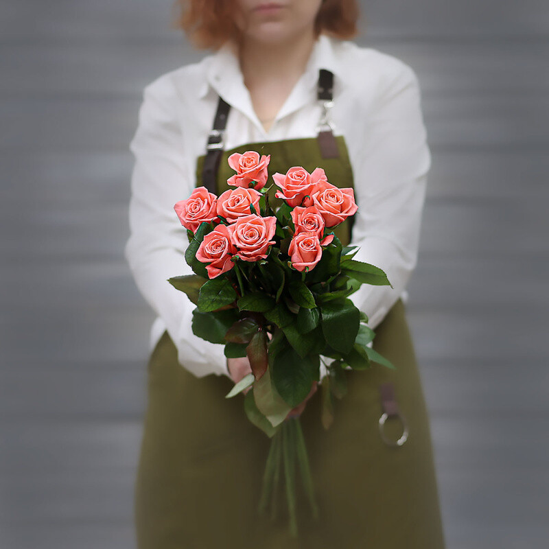 - Букет из 9 коралловых роз (Россия) с лентой 60 см