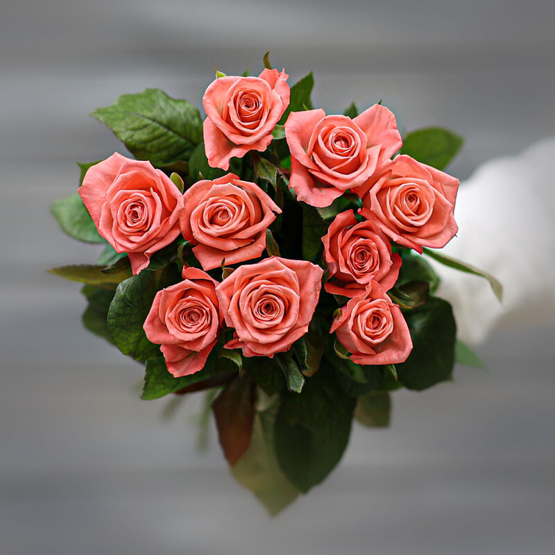 Букет из 9 коралловых роз (Россия) с лентой 60 см
