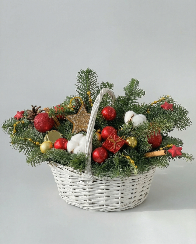 Эта корзина наполнена изысканными элементами, которые добавят волшебства вашему праздничному декору. В ней вы найдете: * Нежный нобилис * Елочные игрушки в ассортименте * Ароматную корицу * Мягкий хлопок Особое внимание уделено елочным игрушкам: звезды и деревянные игрушки могут быть заменены на аналогичные, но другой формы, сохраняя при этом гармоничную цветовую гамму. Пусть каждый элемент этой корзины принесет вам радость и создаст атмосферу уюта и тепла в вашем доме!