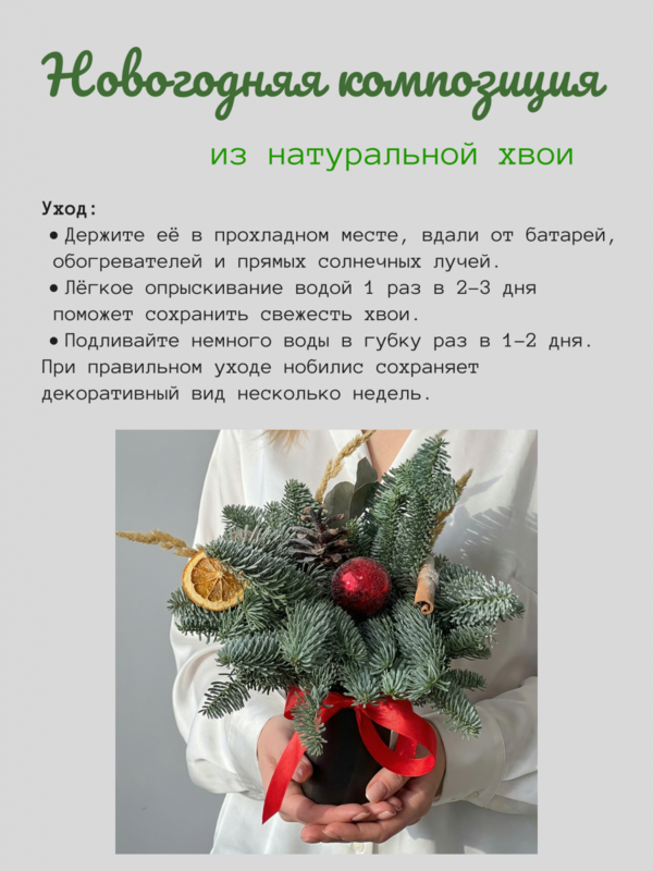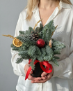 В изящном стаканчике собрана композиция, наполненная теплом и уютом праздничного настроения. В её основе — нежный нобилис, добавляющий свежести и лёгкости. Ароматную ноту вносит корица, создавая атмосферу уюта и тепла. Сушёный апельсин придаёт композиции яркий акцент и наполняет дом цитрусовыми ароматами. Пусть «Праздничный уют» станет ярким акцентом вашего праздничного декора и подарит радость в каждый дом. Состав: нобилис, корица, сушенный апельсин, елочные игрушки, стаканчик, флористический оазис.