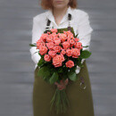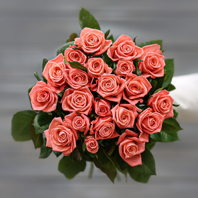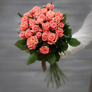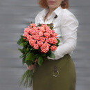 - Букет из 23 коралловых роз (Россия) с лентой 60 см