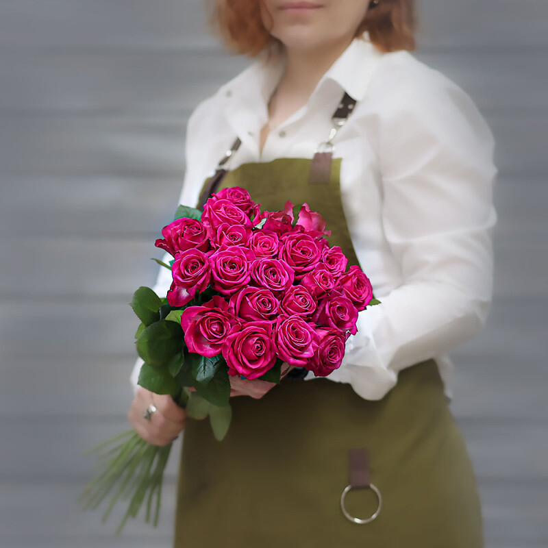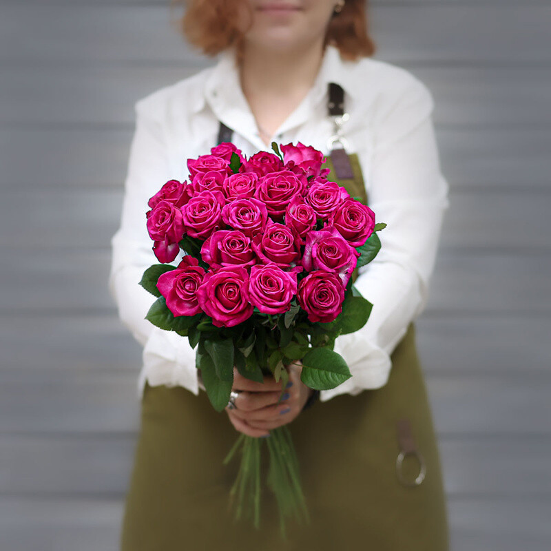 - Букет из 23 малиновых роз (Россия) с лентой 60 см