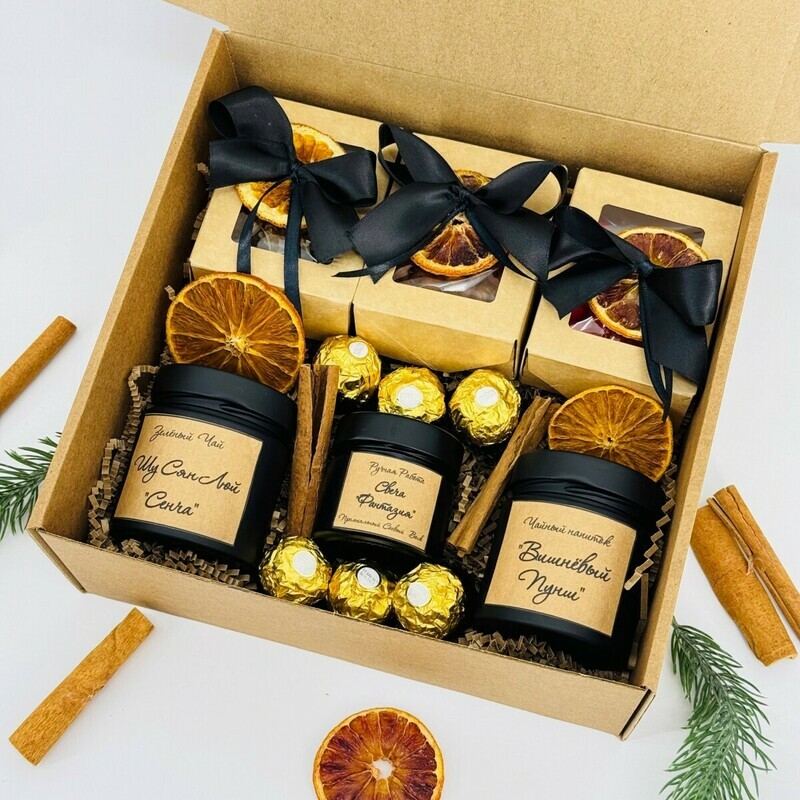 В наборе свеча ручной работы в банке, чай элитный, орехи.