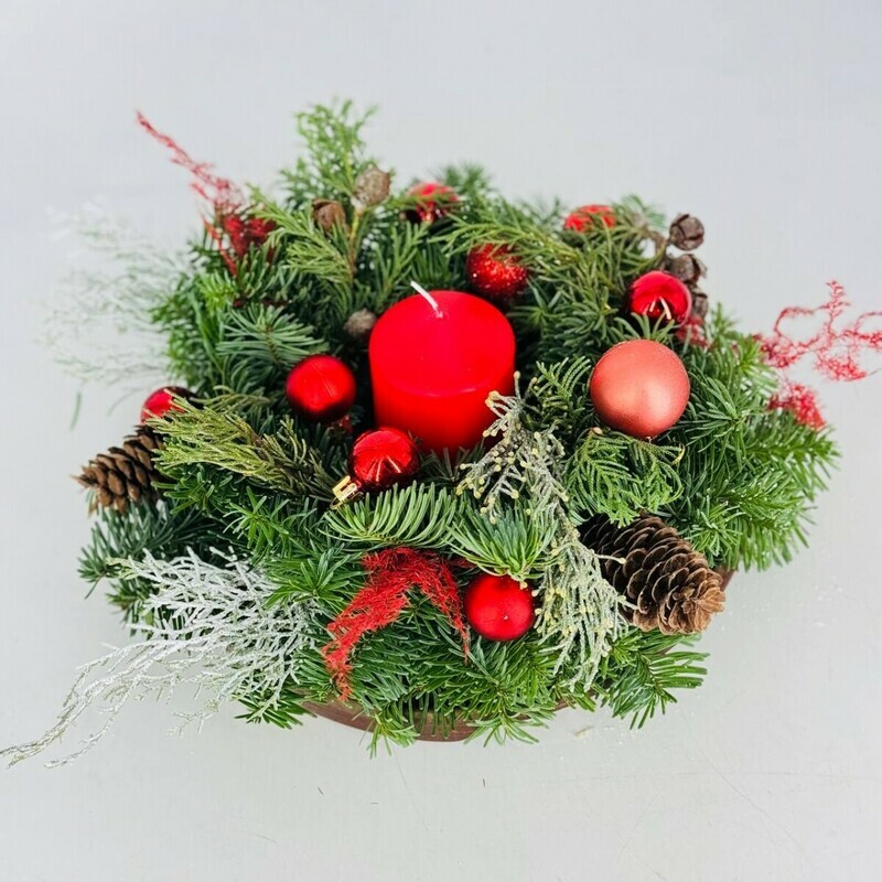 Новогодняя композиция со свечами, идеально дополнит новогодний интерьер дома и офиса. Это отличный способ задекорировать интерьер дома, дачи, коттеджа или офиса под Новый год и Рождество. Такая композиция будет отлично смотреться в ресторане, кафе, галерее и любом другом помещении общественного пользования. Новогодняя композиция на стол из натуральной хвои, усыпанная елочными шарами, станет идеальным дополнением к новогоднему столу. Мы предлагаем вашему вниманию то, что отлично впишется в любой интерьер и не потребует от Вас внимания и ухода. Новогодняя композиция на стол, отлично подходит для небольших квартир и помещений. Если вам нужна идея для необычного и оригинального подарка близким и друзьям, то букет из нобилиса это то, что вам нужно для того, чтобы порадовать себя и близких.