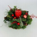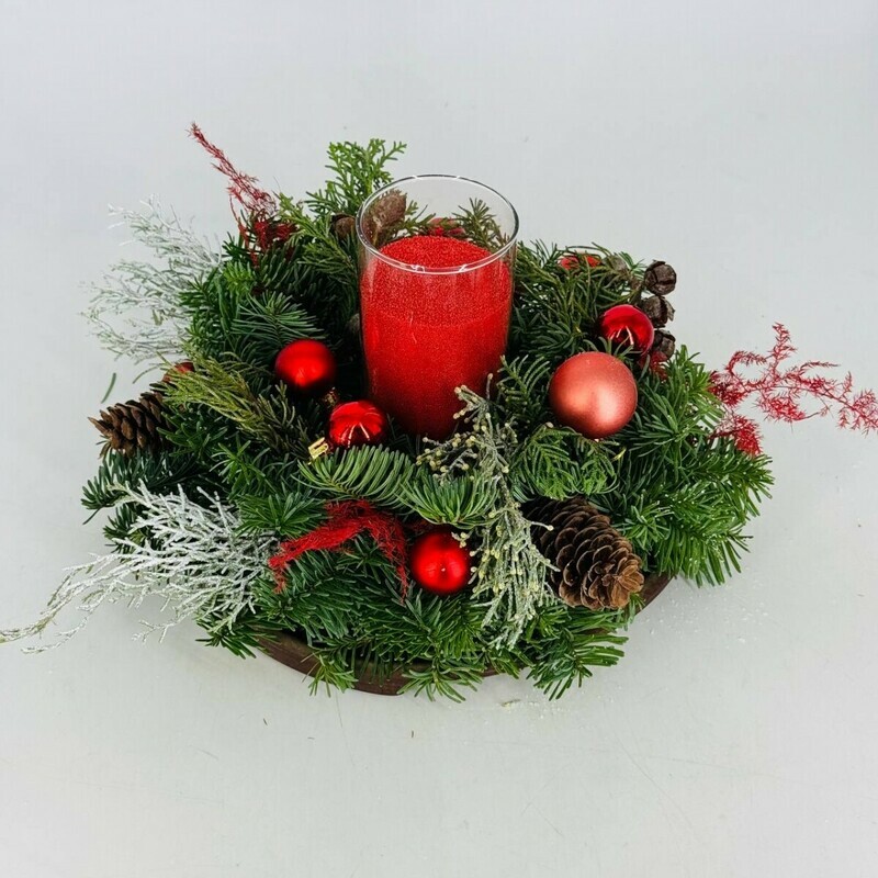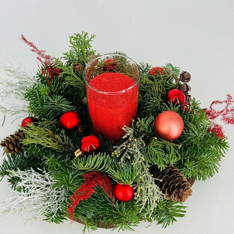 Новогодняя композиция со свечами, идеально дополнит новогодний интерьер дома и офиса. Это отличный способ задекорировать интерьер дома, дачи, коттеджа или офиса под Новый год и Рождество. Такая композиция будет отлично смотреться в ресторане, кафе, галерее и любом другом помещении общественного пользования. Новогодняя композиция на стол из натуральной хвои, усыпанная елочными шарами, станет идеальным дополнением к новогоднему столу. Мы предлагаем вашему вниманию то, что отлично впишется в любой интерьер и не потребует от Вас внимания и ухода. Новогодняя композиция на стол, отлично подходит для небольших квартир и помещений. Если вам нужна идея для необычного и оригинального подарка близким и друзьям, то букет из нобилиса это то, что вам нужно для того, чтобы порадовать себя и близких.