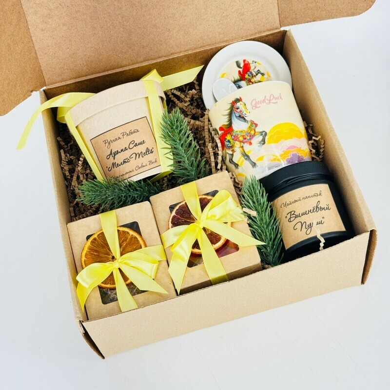 В наборе чай элитный, орехи, новогодняя кружка и арома саше мелтс ручной работы.