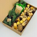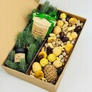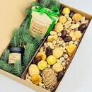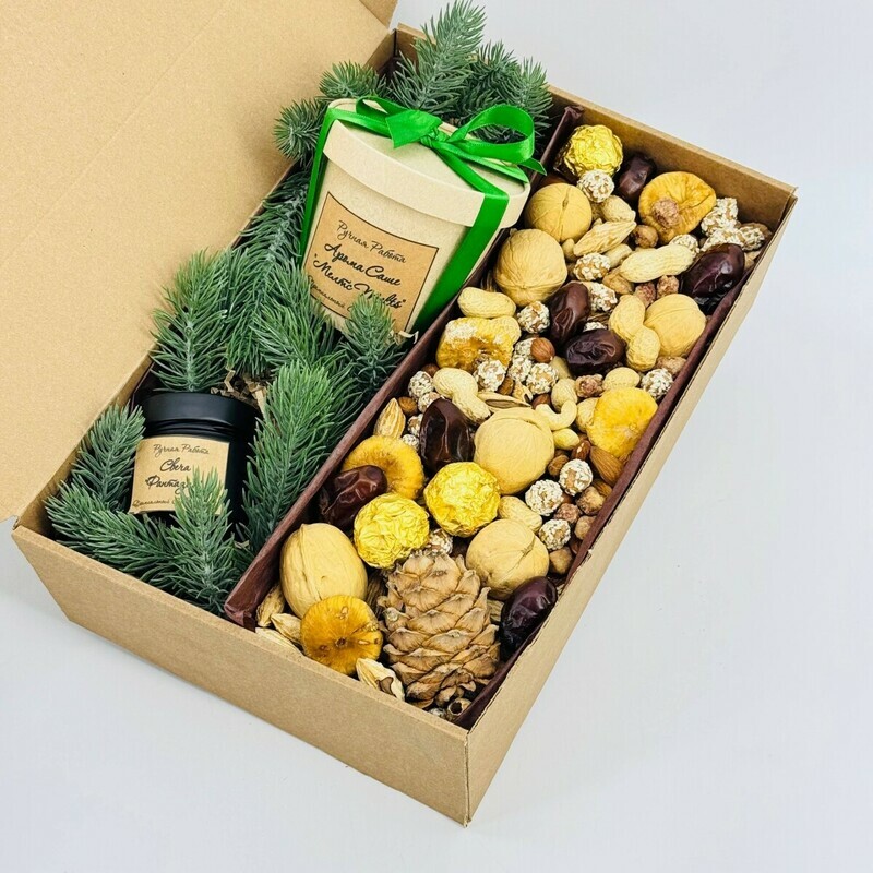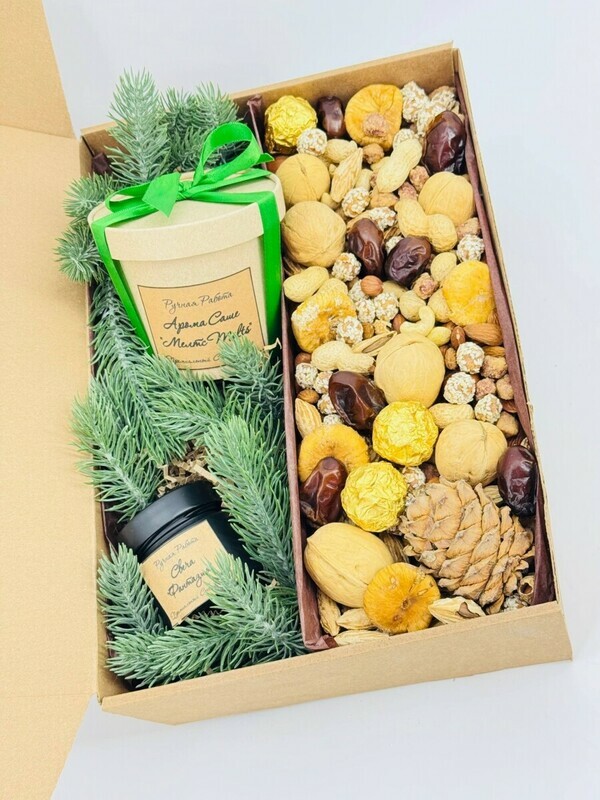 В наборе свеча в банке, арома саше мелтс ручной работы, набор орехов и сухофруктов микс.