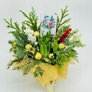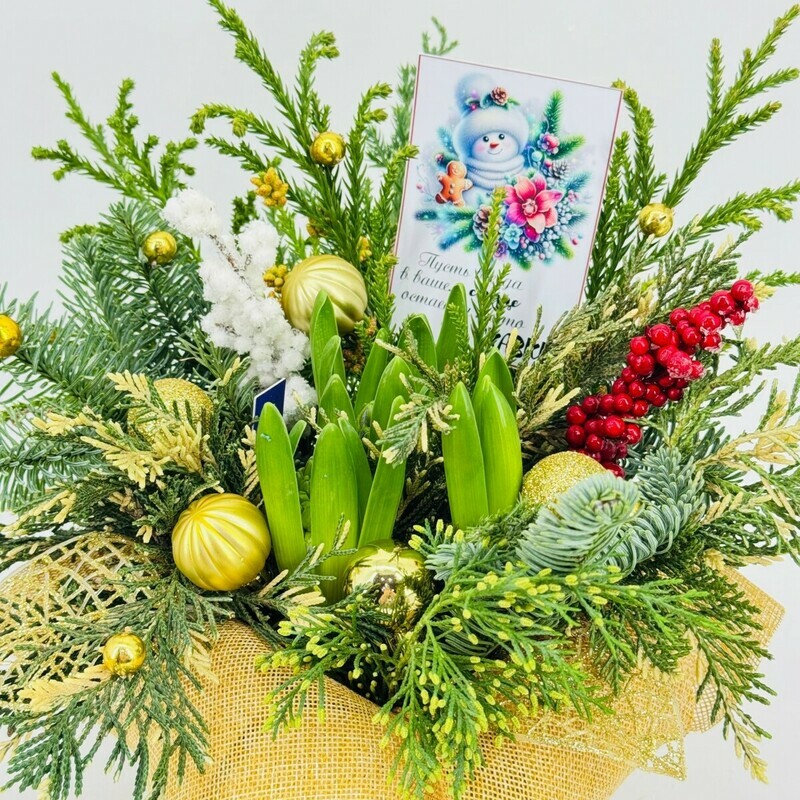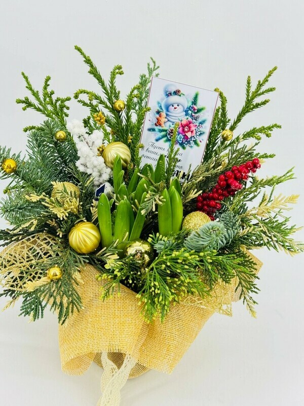 Зимний, новогодний букет из натуральной хвои нобилис с первоцветами гиацинт. Подарок на новый год, стандартный