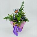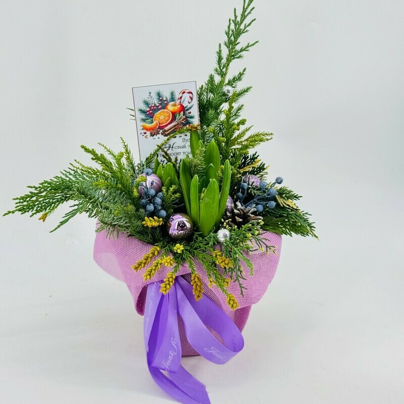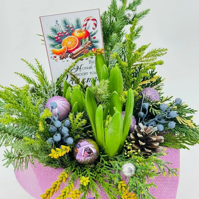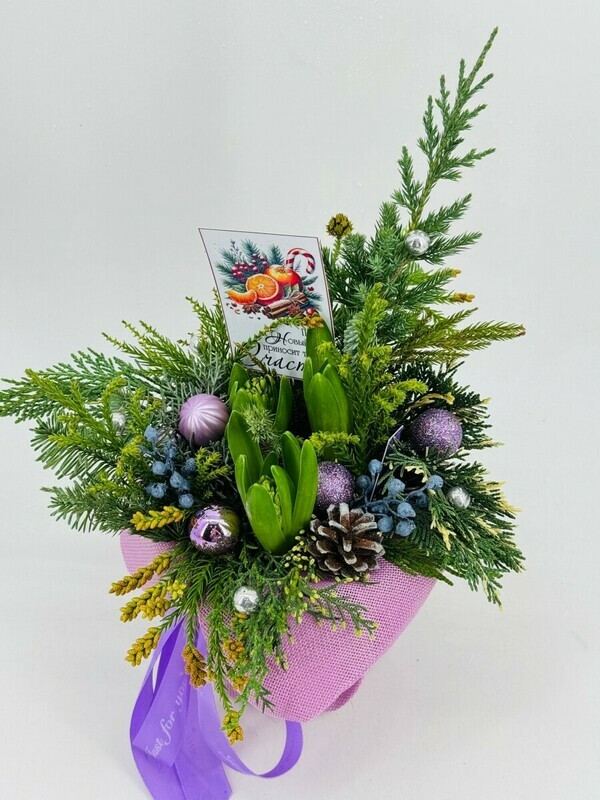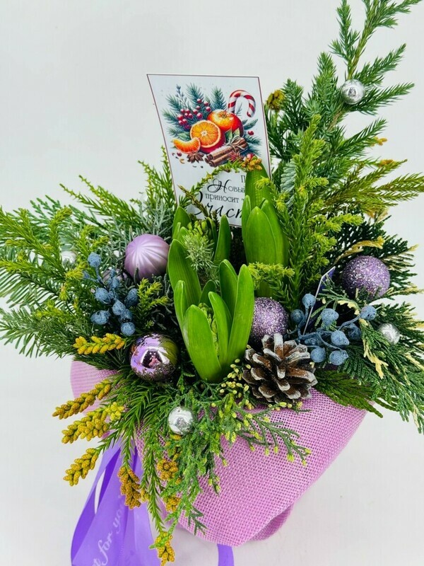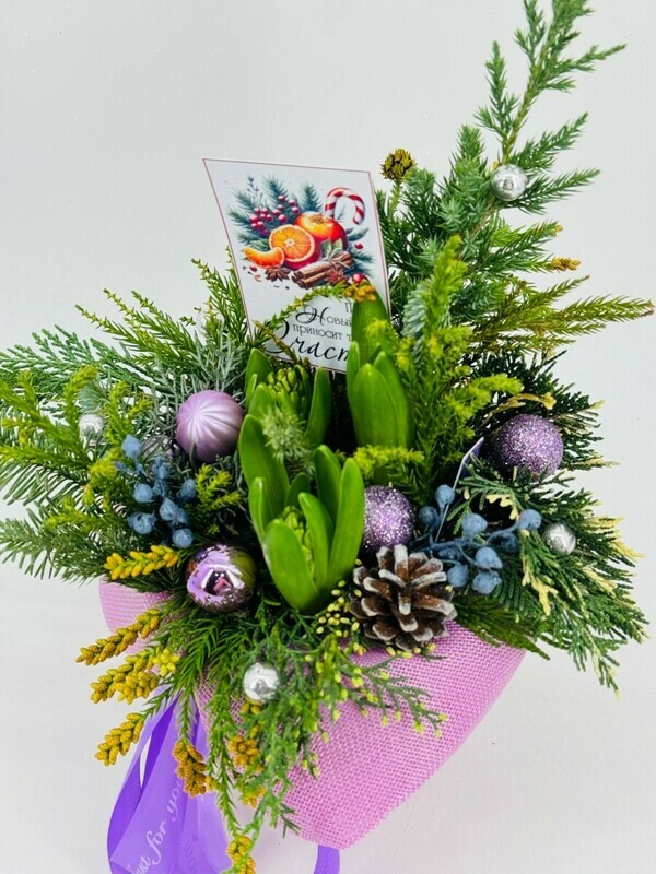 Зимний букет с первоцветами гиацинтами и натуральной хвоей, нобилис. Подарок на новый год, стандартный